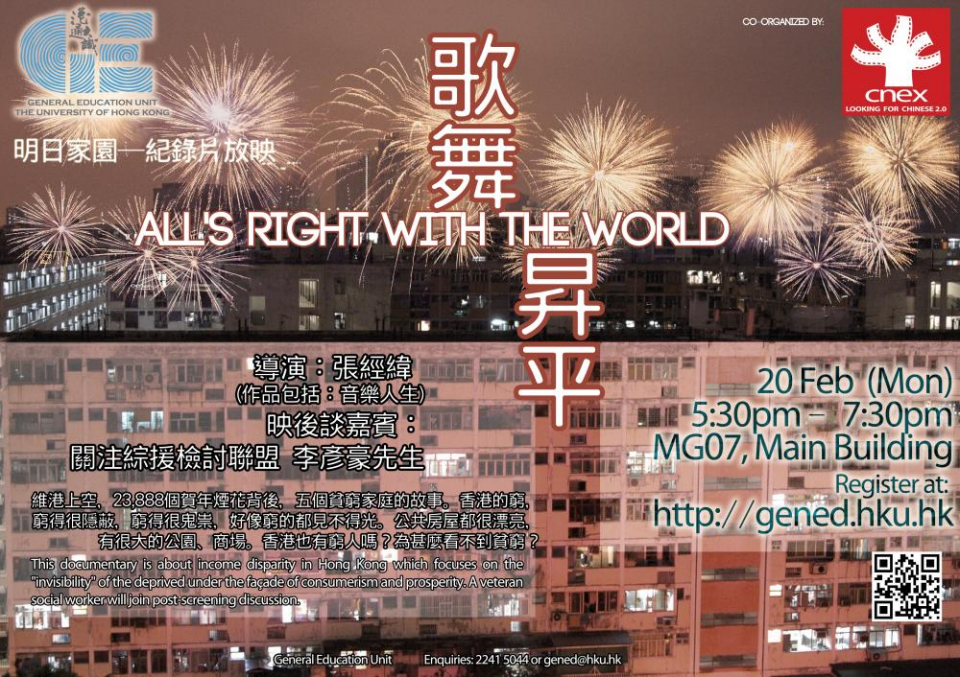 | Summary 內容: | 維多利亞港上空,23,888個賀年煙花背後,五個貧窮家庭的故事。他們貧窮的理由或許不一樣,但卻擁有相似的生活狀態。影片裡穿插著過年的片段,又和一般人過年有難以區分的相同與不同。 香港沒有本地乞丐,有的都是內地丐幫明目張膽的鋪張,弊到要八十歲撿紙皮的,都沒有要飯的,除了瘋了的。香港的窮,窮得很隱蔽,窮得很鬼祟,好像窮的都見不得光。政府給低收入人群建立的公共房屋都會很漂亮,有很大的公園、商場、好像看不到普通意義上的窮人。香港也有窮人嗎?為什麼看不到貧窮? 太平盛世,歌舞昇平,這種社會表層的好,不代表每個香港人都可以享受到。香港的貧民是怎樣的一個生活狀態呢?本片曾入圍08年香港國際電影節、2008 韓國首爾獨立紀錄片非競賽單元、2008 英國萬象電影節展映等。 是次放映會為「明日家園」紀錄片映系列第一節,由香港大學通識教育部及CNEX合辦。 This documentary is about income disparity in Hong Kong which focuses on the "invisibility" of the deprived under the façade of consumerism and prosperity. A veteran social worker will join post-screening discussion. This is the first session of a documentary screening series entitled "The Next Homeland", co-organized by the General Education Unit, HKU and CNEX. |